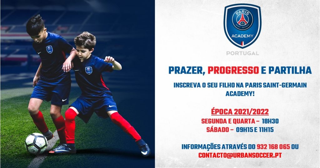 ESTÁ ABERTA A ÉPOCA 2023/2024 DA PARIS SAINT-GERMAIN ACADEMY Está na hora de inscrever seu educando na escola de futebol Paris Saint-Germain Academy para a época 2023/2024 que terá início em setembro de 2023. A escola de futebol Paris Saint-Germain Academy A escola de futebol Paris-Saint Germain Academy oferece sessões de treino para todas as crianças dos 5 a 14 anos, adaptadas à idade e ao nível de cada um. Este ano com ainda mais opções de treino: -Segundas feiras 18h30-20h; -Quartas feiras 16h30-18h e 18h30-20h; -Sextas feiras 17h30-19h; -Sábados 9h15-10h45 e 11h15-12h45; A Paris Saint-Germain Academy oferece muitas vantagens: 37 sessões de treino elaboradas pelo PSG e adaptadas ao nível e à idade das crianças Educadores formados pelo Paris Saint-Germain Acompanhamento personalizado das crianças Equipamento Paris Saint-Germain Academy Possibilidade de participar na Paris Saint-Germain Academy CUP Treinos no centro Urbansoccer Inscrições e todas as informações, horários e preços aqui.