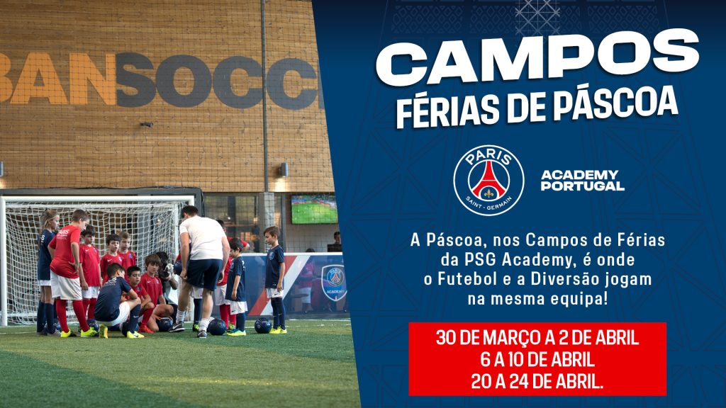 A PSG Academy é uma academia de futebol para crianças dos 4 aos 15 anos e oferece a todas as crianças a oportunidade de partilhar os valores de um grande clube europeu, reconhecido em todo o mundo pelo seu know-how e pela qualidade da sua formação. Datas – PÁSCOA 2026 Para além da academia que funciona durante toda a época desportiva, a PSG Academy realiza também Soccer Camps e tem o prazer de anunciar que se encontram abertas as inscrições para o campo de férias PSG Academy – Páscoa que se realizarão nas seguintes semanas : 30 de Março a 2 de Abril – 205€ 6 a 10 de Abril – 240€ 20 a 24 de Abril – 240€ Este valor inclui todas as refeições, atividades, um equipamento desportivo e seguro. Para mais informações, contacte o seu centro UrbanSoccer! Os campos de férias são direcionados para a prática do futebol, sobretudo para a melhoria das capacidades técnico/táticas, onde ainda existe espaço para outro tipo de atividades desportivas ao ar livre, Padel, Bubble Futebol e muito mais! Para mais informações, contacte o seu centro UrbanSoccer! ⚽️ Poderá inscrever-se através deste link.